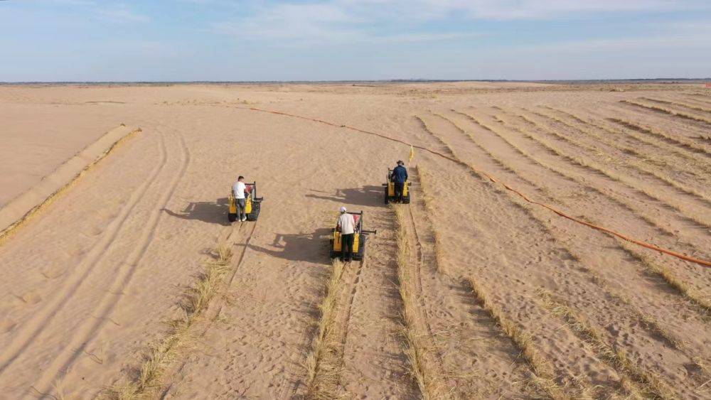 “過去我們不知道什麼樣的機械適合在沙漠腹地運行,扎草方格和種苗一直依靠人工,效率很低。”杜永軍説,烏拉特後旗沙化土地面積2065萬餘畝,已經治理的面積僅有459萬餘畝,剩餘治理任務重、難度大,很多地方連路都沒有,光靠人工揹着草和樹進去,耗時太長,“‘人海戰術’已經難以滿足新時代防沙治沙需求”。