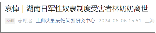 微信公眾號“上師大慰安婦問題研究中心”消息,2024年6月6日13時許,原二戰時期日軍“慰安婦”制度受害倖存者林奶奶(匿名,根據老人及家屬的意願,上海師範大學中國“慰安婦”問題研究中心暫不公開老人的個人信息)在湖南平江縣去世,享年95歲。