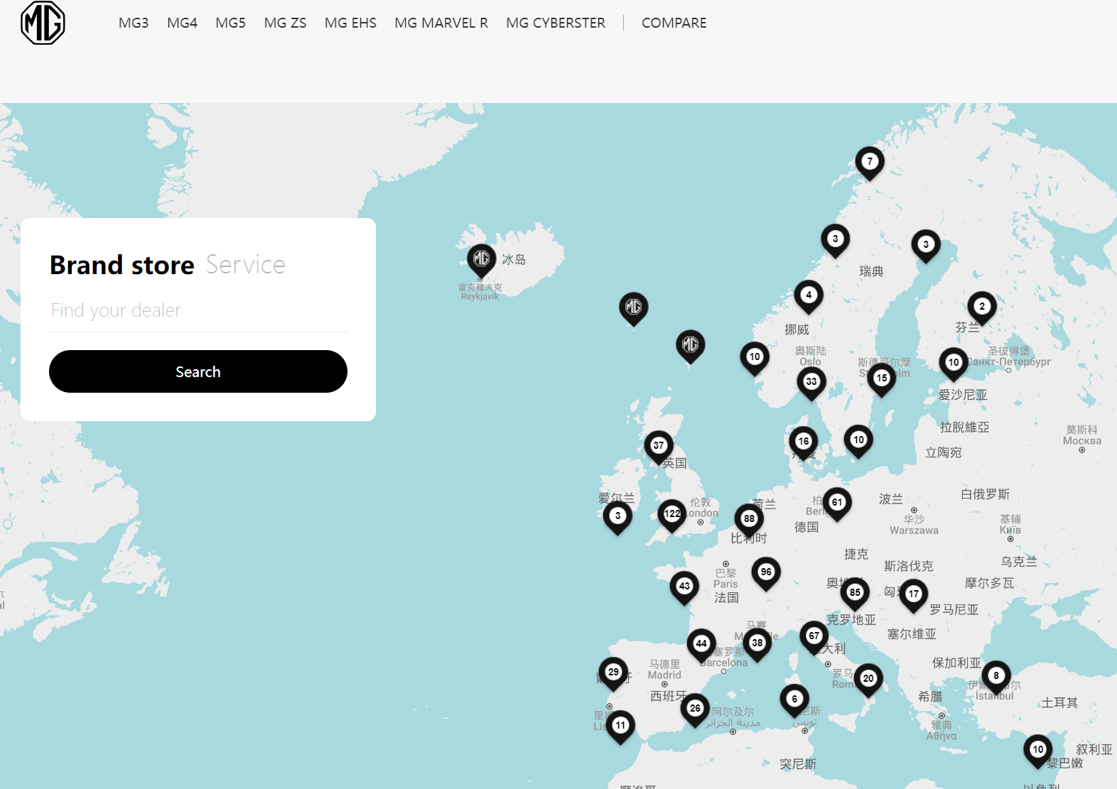 名爵在歐網點建設 圖源:MG歐洲官網截圖