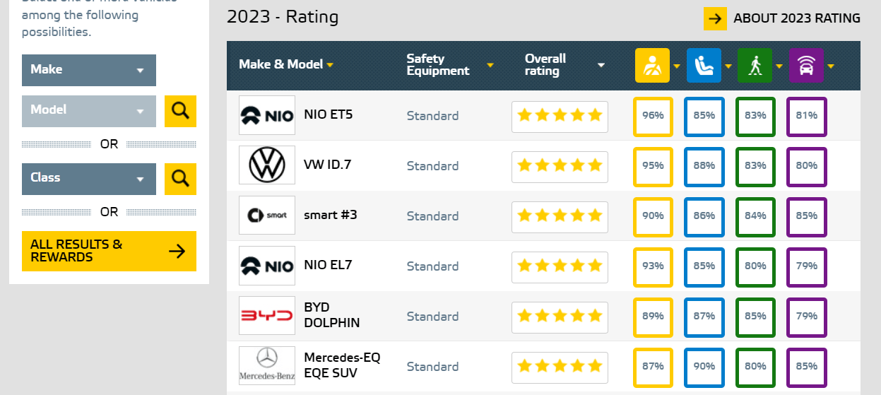在產品安全性上,MG4 EV通過了歐洲E-NCAP五星安全標準認證、歐盟ECE和E-MARK等認證;而去年參與歐洲新車評價計劃的比亞迪海豚、蔚來ET5、小鵬P7等9款中國品牌汽車也均取得五星級評價。