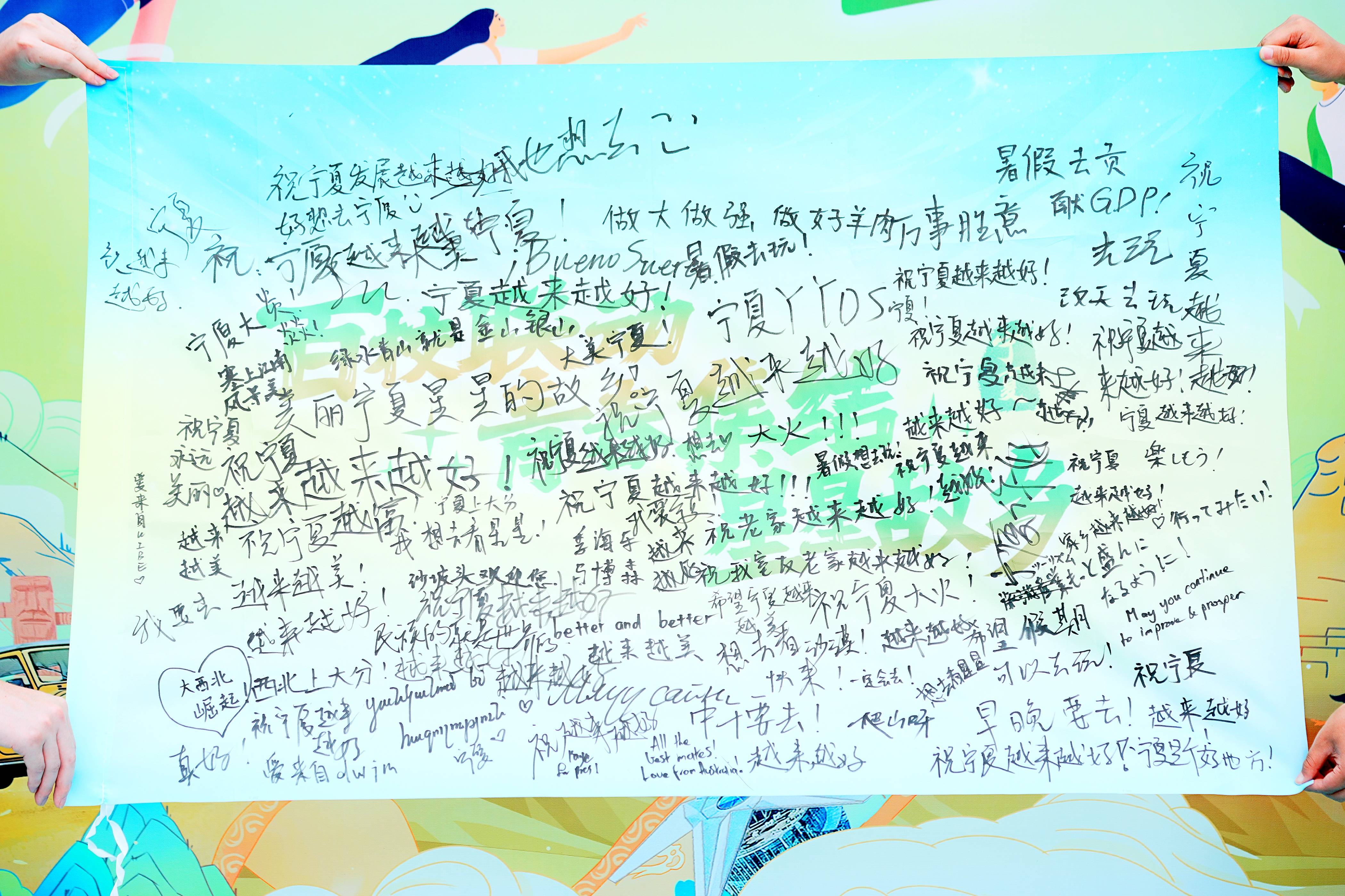 “暑期想去玩”“好想去寧夏”“我想去看星星”“塞上江南風景美”“祝寧夏越來越好”……在星空許願牆、主題活動旗幟上,學生們紛紛留下了對寧夏的祝福。圖源:寧夏文化和旅遊廳