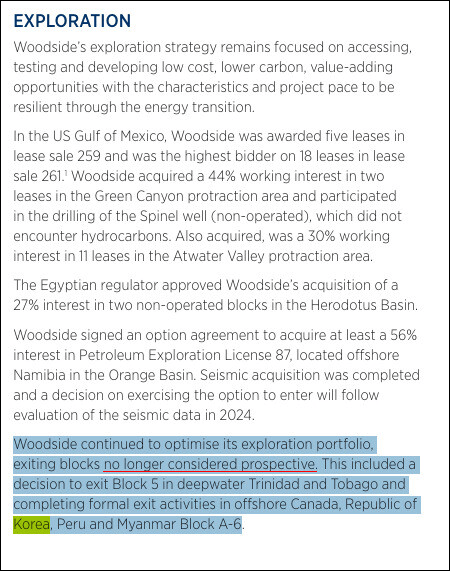 報道稱,伍德賽德在官網公開的2023年年度報告顯示,該公司在優化勘探投資組合的過程中剔除了包括韓國在內的三個項目,理由是認為其“不再有潛力”(no longer considered prospective)。《韓民族日報》認為,這可以解釋為伍德賽德判斷其沒有事業發展可能性,所以選擇了離開。