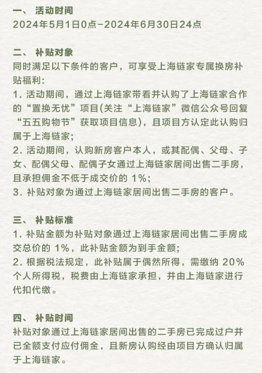藉着這股熱潮,6月5日,上海鏈家官方公眾號也火速發文,推出“以舊換新”活動,對通過鏈家中介購房或售房的客户補貼全款1%(需繳納20%個人所得税)的中介費。