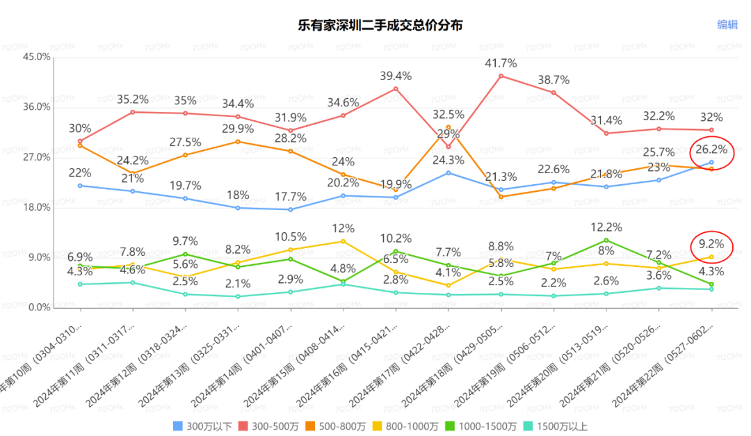 同時,5月27日-6月2日一週時間內,深圳所有成交數據中,800萬元-1000萬元改善型豪宅房源的成交佔比進一步上漲,環比提升2個百分點達到9.2%。