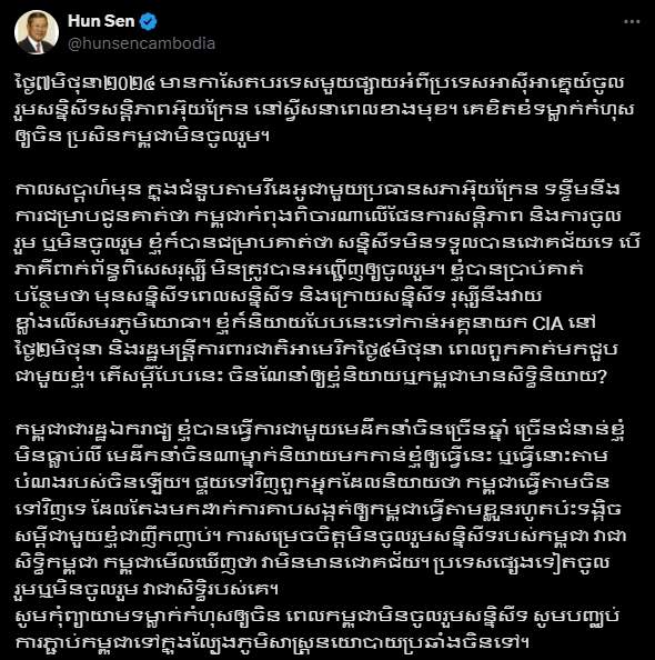 “6月7日,一家外媒報道了東南亞國家出席瑞士和會的情況,如果柬埔寨不參會,他們試圖指責中國,”聲明中,洪森直接駁斥相關報道,並指出,他近日已經告知烏克蘭方面以及美國中央情報局局長、國防部長:如果不邀請俄羅斯參會,和會不會取得成功。