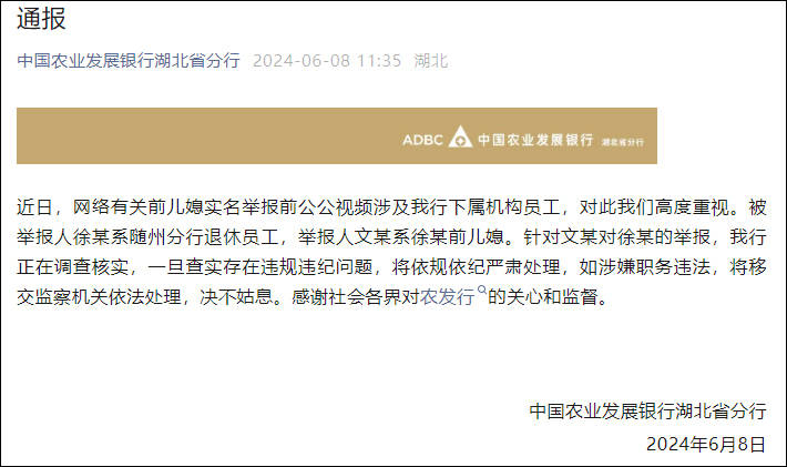 微信公眾號“中國農業發展銀行湖北省分行”6月8日發佈通報稱,近日,網絡有關前兒媳實名舉報前公公視頻涉及該行下屬機構員工,對此銀行高度重視。被舉報人徐某系隨州分行退休員工,舉報人文某系徐某前兒媳。針對文某對徐某的舉報,該行正在調查核實,一旦查實存在違規違紀問題,將依規依紀嚴肅處理,如涉嫌職務違法,將移交監察機關依法處理,決不姑息。感謝社會各界對農發行的關心和監督。