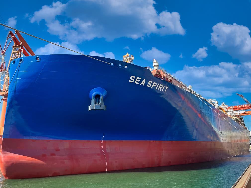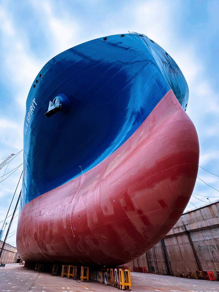 5月27日,我國自主研發設計的17.5萬立方米液化天然氣(LNG)運輸船在中國船舶集團大連船舶重工集團有限公司出塢。(中國船舶大連造船供圖)