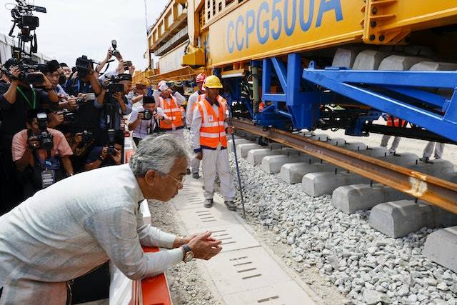 2023年12月11日,由中國交通建設集團有限公司承建的馬來西亞東海岸鐵路項目軌道工程啓動儀式在馬來西亞彭亨州首府關丹市舉行。馬來西亞最高元首阿卜杜拉在儀式上正式啓動馬東鐵項目軌道鋪設。圖自新華社