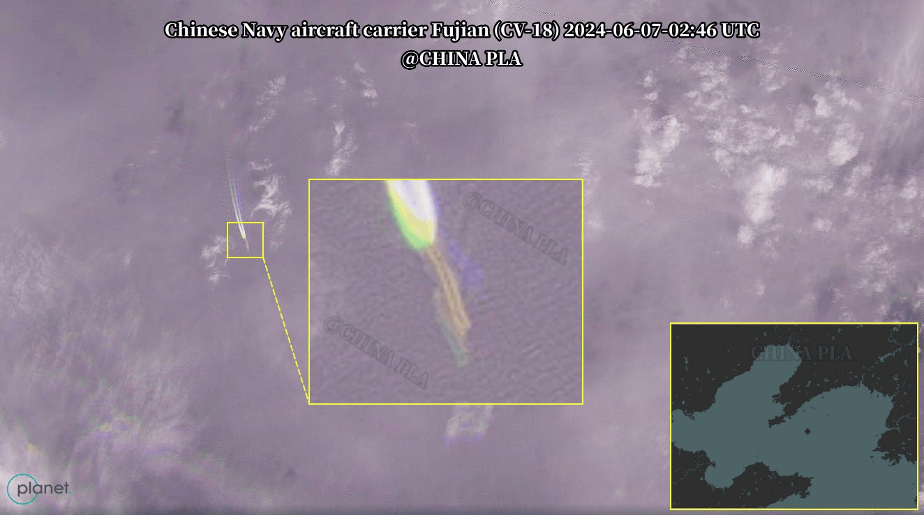 5月23日猝然啓動的“聯合利劍-2024A”環台軍演,更是使很多人差點忘了,福建艦也是在同一天再次駛向大海,開啓第二次試航。雖然相比上一次在東海海域,航渡過程中會經過國際航運水道的試航,此次福建艦北上試航的路上沒有再次出現民船視角下的“追星照”,但對於西方商業(以及更高級別的軍用)衞星來説,在我方公佈的禁航區範圍內尋找福建艦自然不是難事。