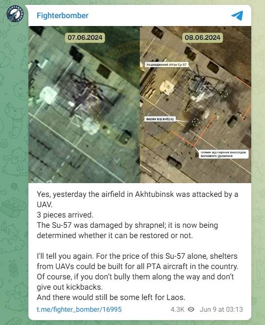 俄羅斯特別軍事行動相關社交賬號Fighterbomber發文證實此事。該賬號稱,蘇-57被彈片損壞,目前正在確定是否能被修復。