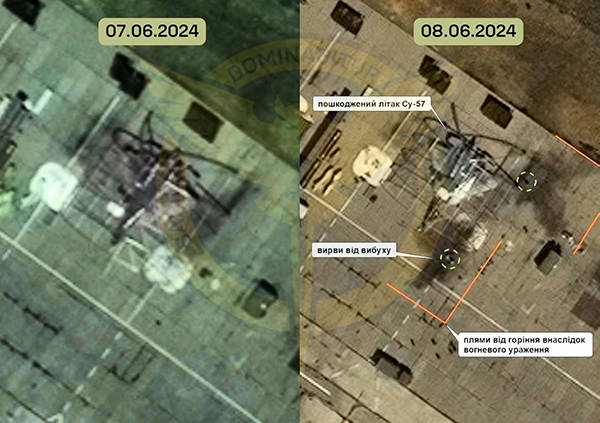烏克蘭國防部網站公佈了該機場的衞星圖像。圖像顯示,6月7日,這架蘇-57完好無損,8日,該飛機出現彈坑和攻擊引發火災的痕跡。