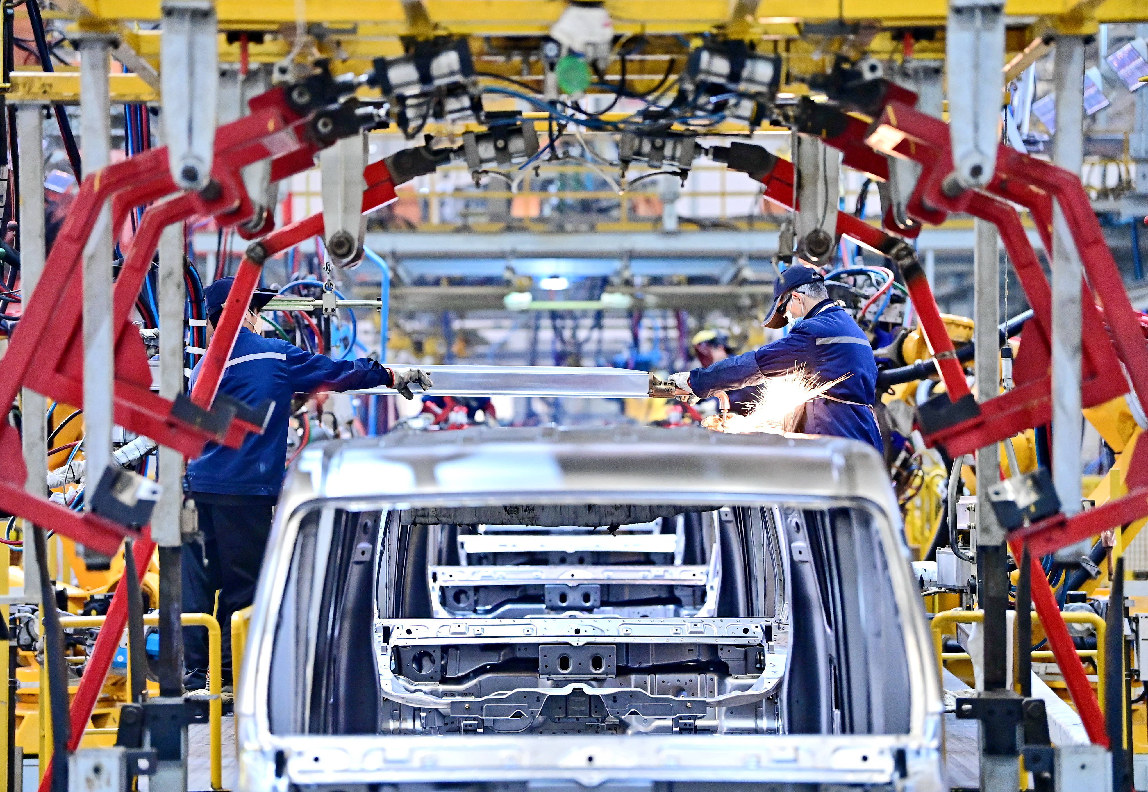 2023年12月25日,江西省贛州市,工人在衝焊生產線上焊接組裝出口南美的新能源電動汽車(東方IC)