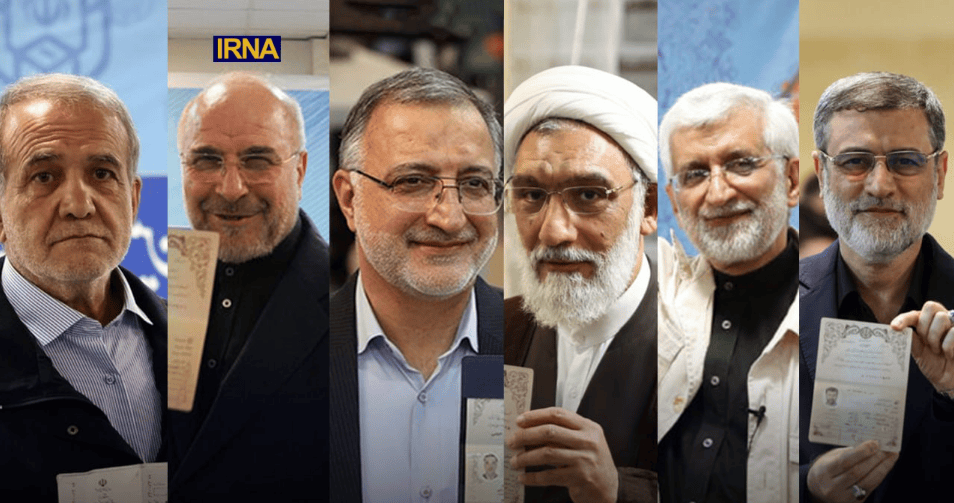 6名總統候選人分別是伊朗議會議長卡利巴夫、伊朗現任副總統兼伊朗烈士基金會負責人加吉扎德、伊朗前首席核談判代表賈利利、伊朗前衞生部長巴迪什安、伊朗前司法部長、內政部長普爾穆罕默迪和德黑蘭市長扎卡尼。