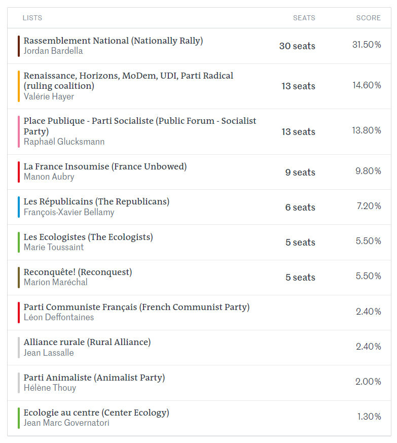 五年一次的歐洲議會選舉於當地時間6日至9日舉行,包括法國在內的大部分歐盟成員國在9日進行了投票,法國選民將投票選出81名代表法國的歐洲議會議員,席位數僅次於德國的96席。歐洲議會議員可以決定哪些法律適用於整個歐盟,並批准歐盟預算和監督資金使用。