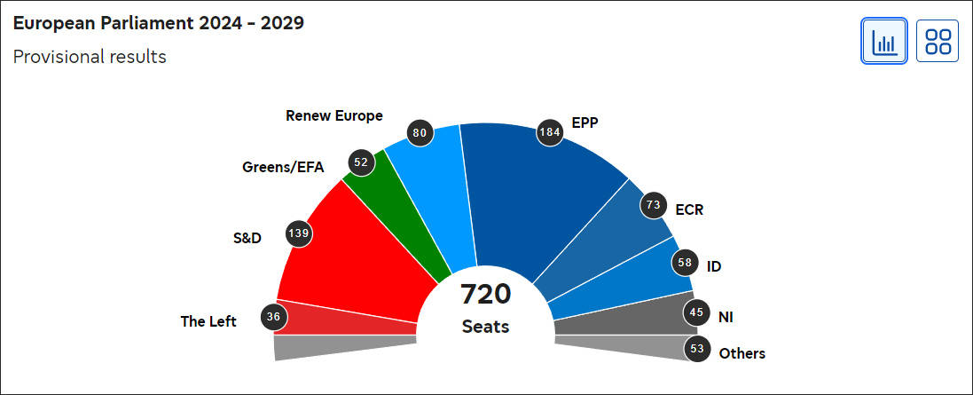 路透社援引出口民調預測,經歷新一輪“洗牌”後,親歐盟的中右翼、中左翼、自由派和綠黨將保留歐洲議會720個議席中的460個,但疑歐右派歐洲保守派和改革主義者(ECR)黨團、“身份與民主”(ID)黨團和尚未加入任何黨團的德國選擇黨議員合計將獲得約146個席位,較此前增加了19個席位。