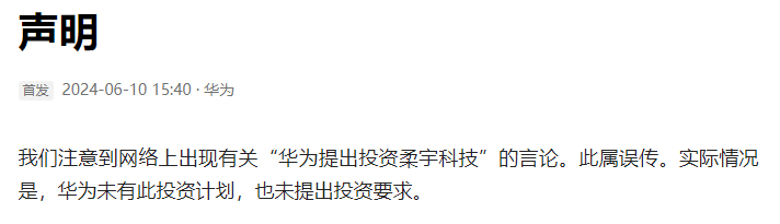 6月10日,華為集團今日頭條官方賬號發佈聲明:我們注意到網絡上出現有關“華為提出投資柔宇科技”的言論。此屬誤傳。實際情況是,華為未有此投資計劃,也未提出投資要求。
