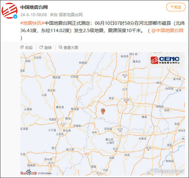 河北邯鄲市磁縣發生2.5級地震,震源深度10千米