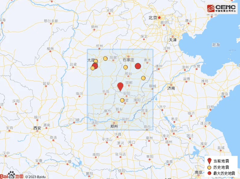 據微信公眾號“中國地震台網”介紹,根據中國地震台網速報目錄,震中周邊200公里內近5年來發生3級以上地震共10次,最大地震分別是2023年11月30日在山西太原市清徐縣發生的3.7級地震(距離本次震中184公里)和2021年7月15日在河北邢台市寧晉縣發生的3.7級地震(距離本次震中156公里),歷史地震分佈如圖。