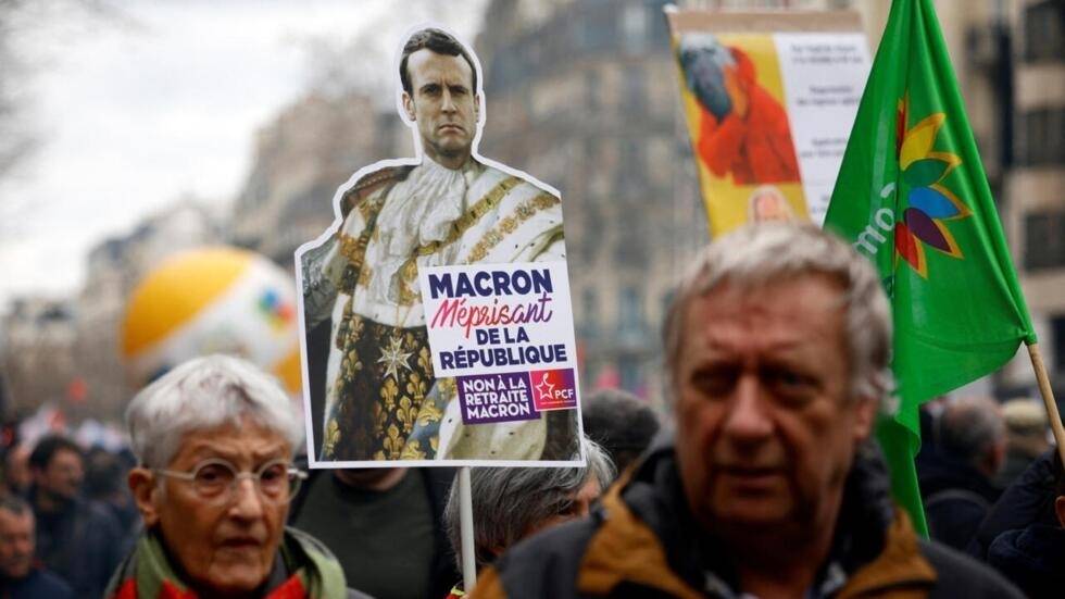2023年3月7日,抗議法國政府退休改革計劃示威隊伍中的一個標語牌,上面寫着“馬克龍,蔑視共和國”。 圖自路透社/Sarah Meyssonnier