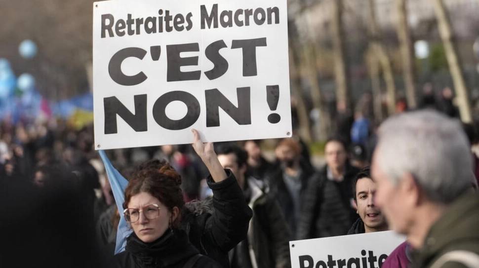 2023年2月16日,法國民眾應工會號召上街抗議馬克龍退休改革計劃。資料圖來自AP/Christophe Ena