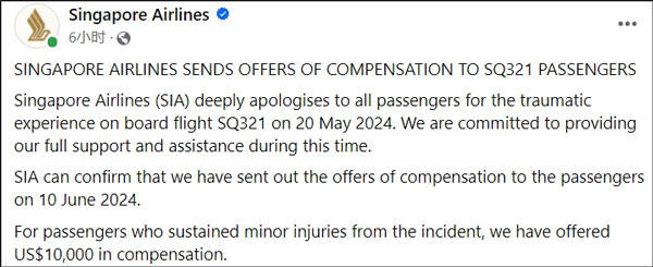新航6月11日在臉書(Facebook)發佈聲明稱,向SQ321航班所有乘客深表歉意,承諾會竭盡所能提供支持和協助,該公司6月10日已通過電子郵件向所有受影響的搭乘遇險航班的乘客提出賠償建議。