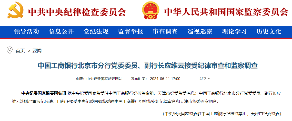 據中央紀委國家監委網站11日消息,據中央紀委國家監委駐中國工商銀行紀檢監察組、天津市紀委監委消息:中國工商銀行北京市分行黨委委員、副行長應維雲涉嫌嚴重違紀違法,目前正接受中央紀委國家監委駐中國工商銀行紀檢監察組紀律審查和天津市監委監察調查。