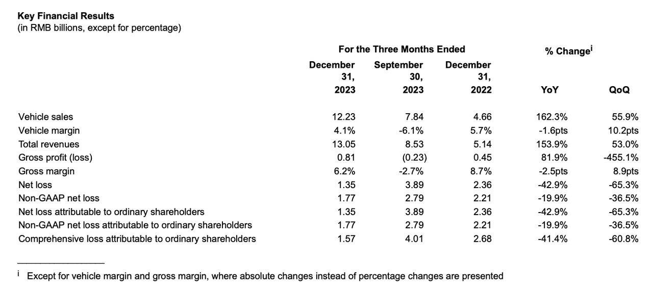 在核心的財務數據上,小鵬汽車第一季度車輛銷售收入為 55.4 億元人民幣,同比增長 57.8%,環比下降 54.7%;一季度小鵬汽車淨虧損為 13.7 億元人民幣,相比 2023 年同期的 23.4 億元人民幣有所降低,和 2023 年第四季度的 13.5 億元人民幣較為接近。