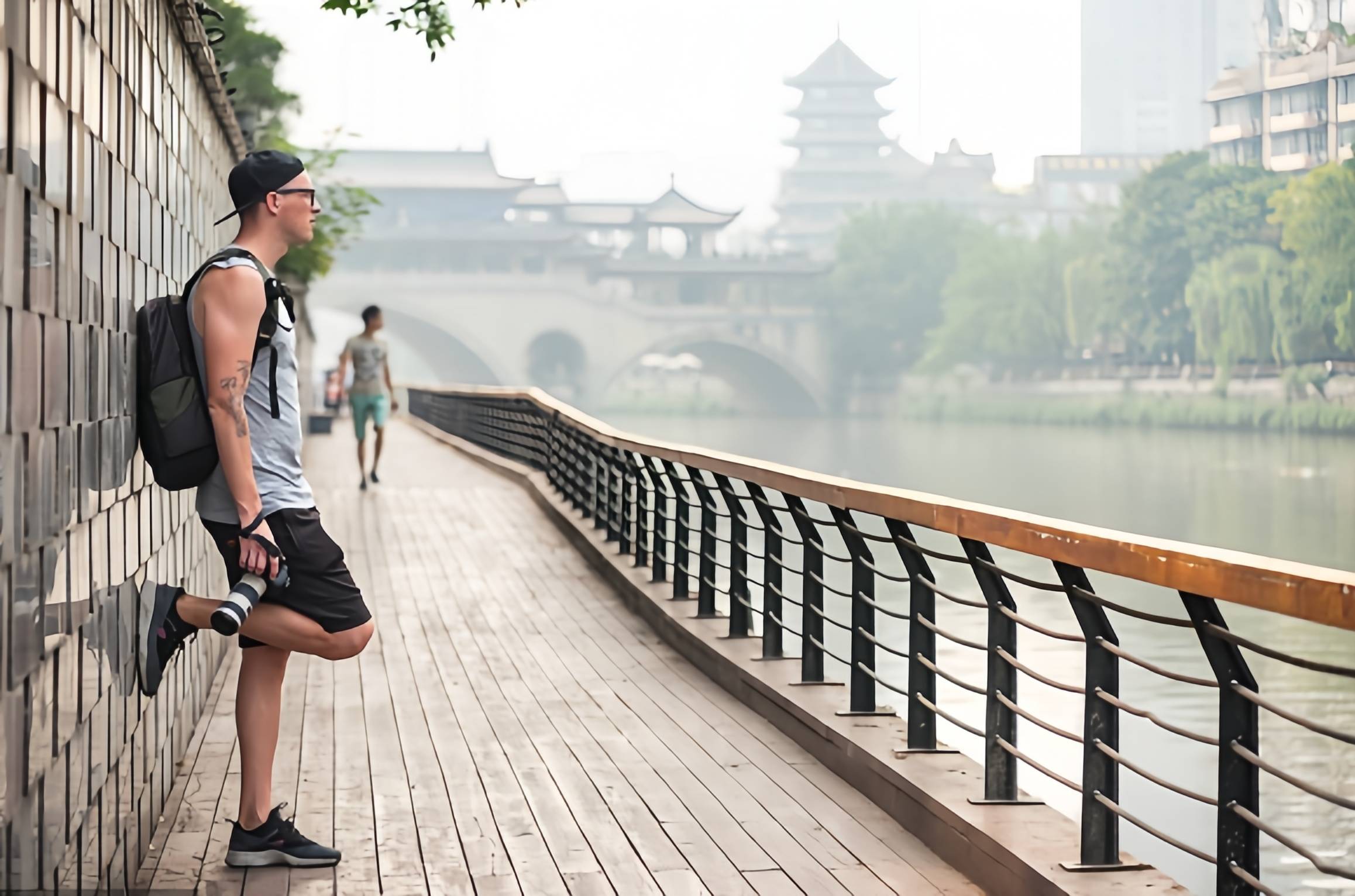一名外籍遊客在成都府南河畔駐足。圖源:視覺中國