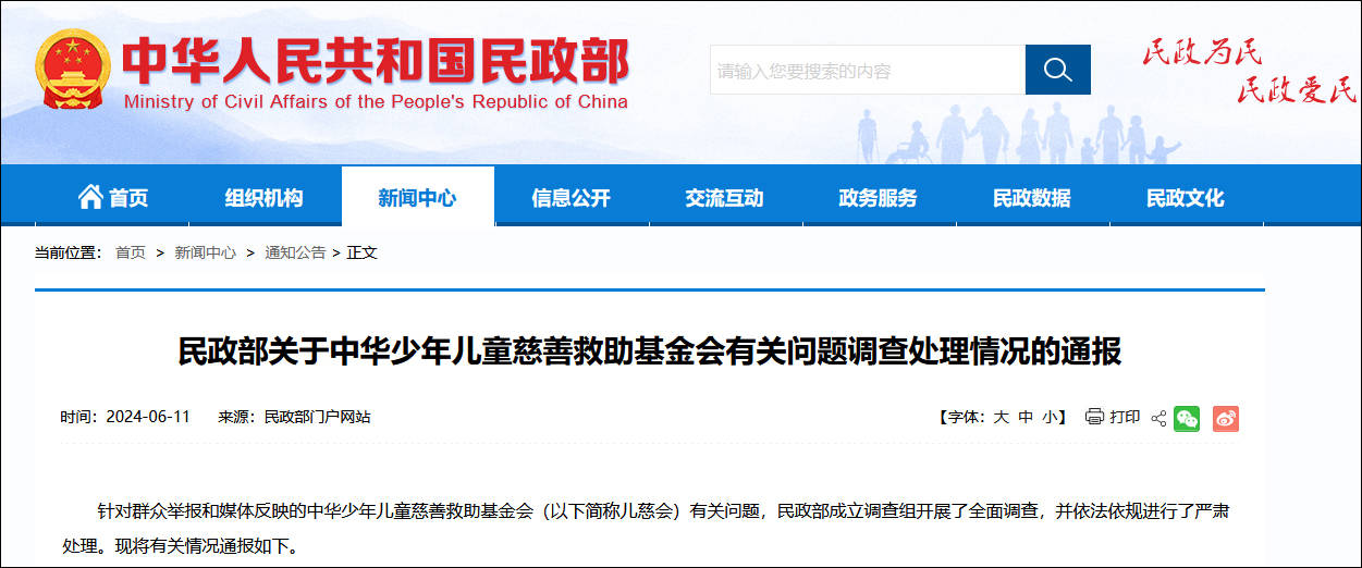 民政部網站6月11日發佈《民政部關於中華少年兒童慈善救助基金會有關問題調查處理情況的通報》。