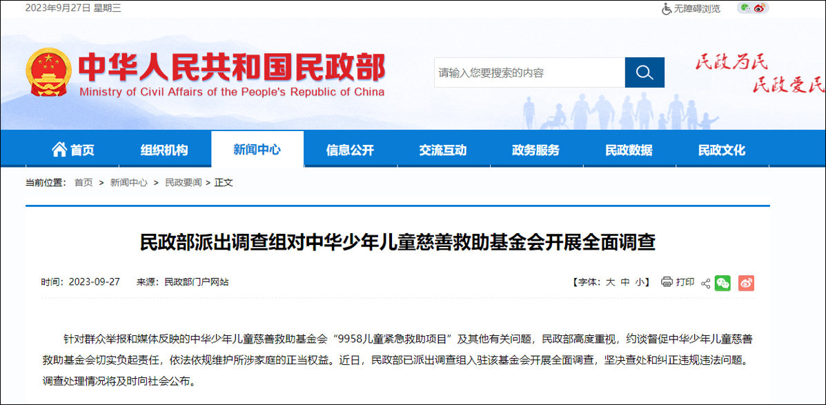 民政部網站9月27日發佈消息,針對羣眾舉報和媒體反映的中華少年兒童慈善救助基金會“9958兒童緊急救助項目”及其他有關問題,民政部高度重視,約談督促中華少年兒童慈善救助基金會切實負起責任,依法依規維護所涉家庭的正當權益。近日,民政部已派出調查組入駐該基金會開展全面調查,堅決查處和糾正違規違法問題。調查處理情況將及時向社會公佈。
