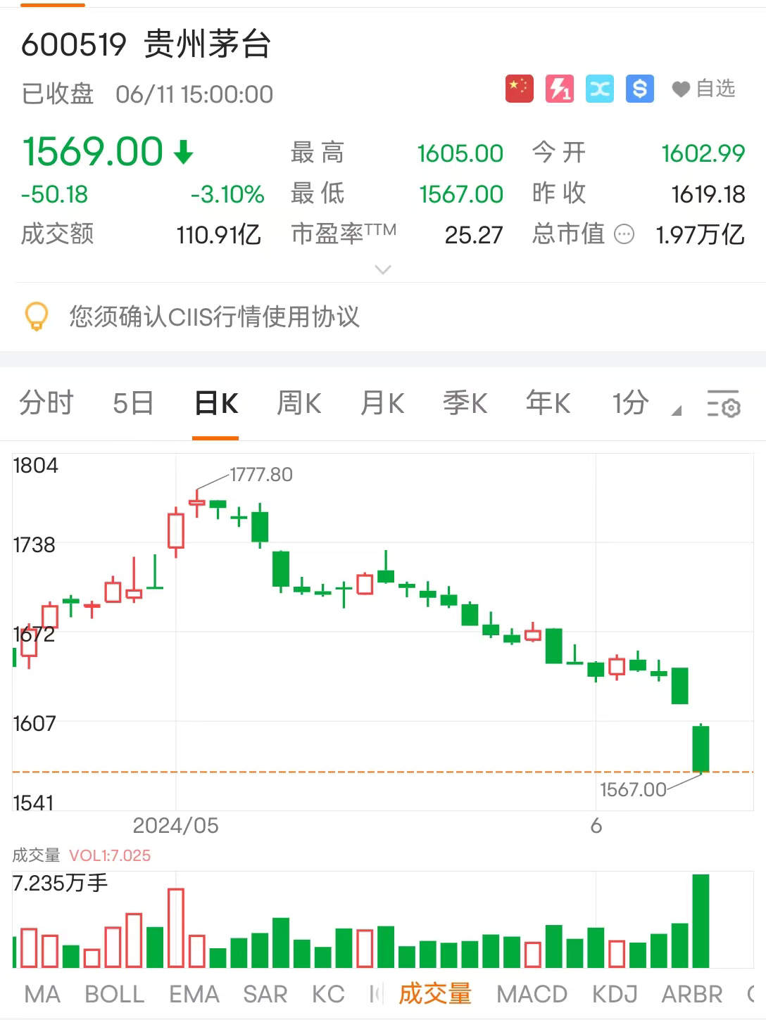 或受價格因素影響,貴州茅台股價連跌數週後,今日再次出現跳水行情,股價低開低走,報收1569元,**跌幅3.1%,一日間總市值縮水630.36億元,**為1.97萬億元。