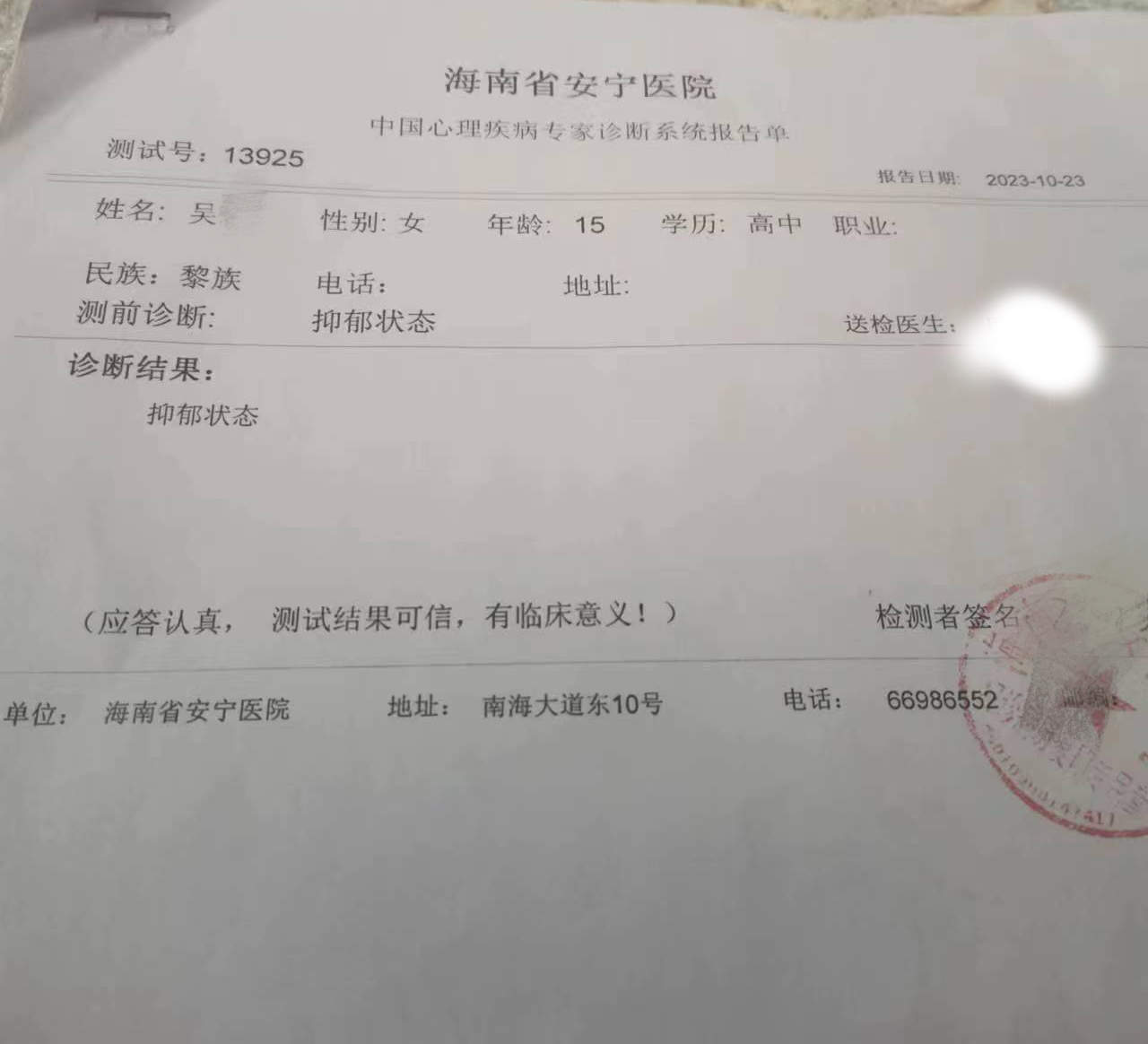2023年10月,吳花(化名)被診斷出“抑鬱狀態”。