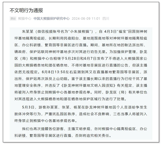 通報稱,期間,基地所在地的耿達派出所、鎮政府、保護站聯同神樹坪基地多次對其進行勸告無果。後續發佈相關公告後,該主播依然無視規定。6月8日13:50左右監測到其又在直播基地繁育園等非展區,派出所、保護站再次派員上山勸阻。鑑於該主播長期以來的直播行為已經干擾了基地管理安全秩序,並違反了《卧龍神樹坪基地文明入園須知》有關規定,該主播將被列入終身禁止到熊貓中心各基地參觀名單。同時,卧龍區(局)有關單位也對其違規進入大熊貓棲息地和潛在棲息地保護區域行為進行了處理。