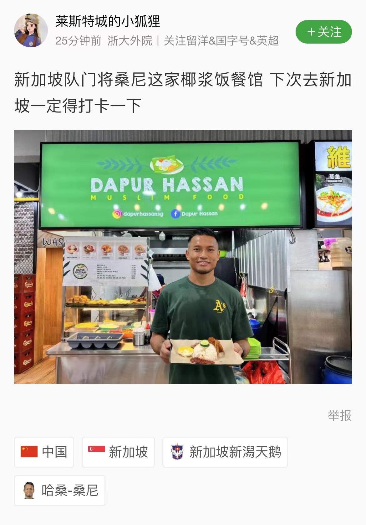 終場哨一吹響,知恩圖報的中國球迷就找到了桑尼在新加坡開的椰漿飯餐廳(DAPUR HASSAN),有的在平台上刷好評,有的甚至直接通過餐廳照片裏的二維碼轉賬。