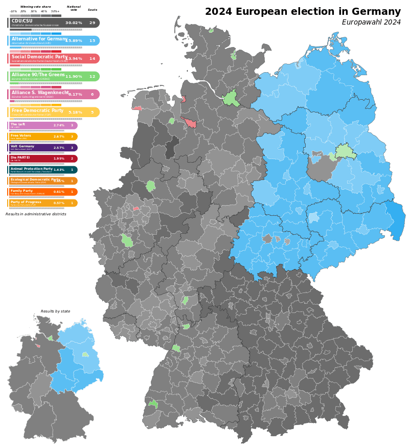 2024德國歐洲議會各州選舉投票結果呈現東西德國分野。圖片來源:維基百科