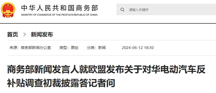據商務部網站12日消息,商務部新聞發言人就歐盟發佈關於對華電動汽車反補貼調查初裁披露答記者問。