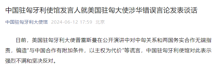 據中國駐匈牙利大使館微信公眾號12日消息,日前,美國駐匈牙利大使普雷斯曼在公開演講中對中匈關係和兩國務實合作無端指責,編造“與中國合作有附加條件,以主權為代價”等謊言,中國駐匈牙利使館對此表示強烈不滿和堅決反對。
