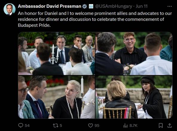 他表示,自己會定期召集來自各領域的匈牙利年輕人進行討論,他們“一致認同”匈牙利想要歐洲和美國的政治、經濟和安全模式,不想要“俄羅斯模式”或“中國模式”。就在11日當天,普雷斯曼還提早離開了匈牙利美國商會的活動,與當地年輕人慶祝布達佩斯驕傲月的開始。