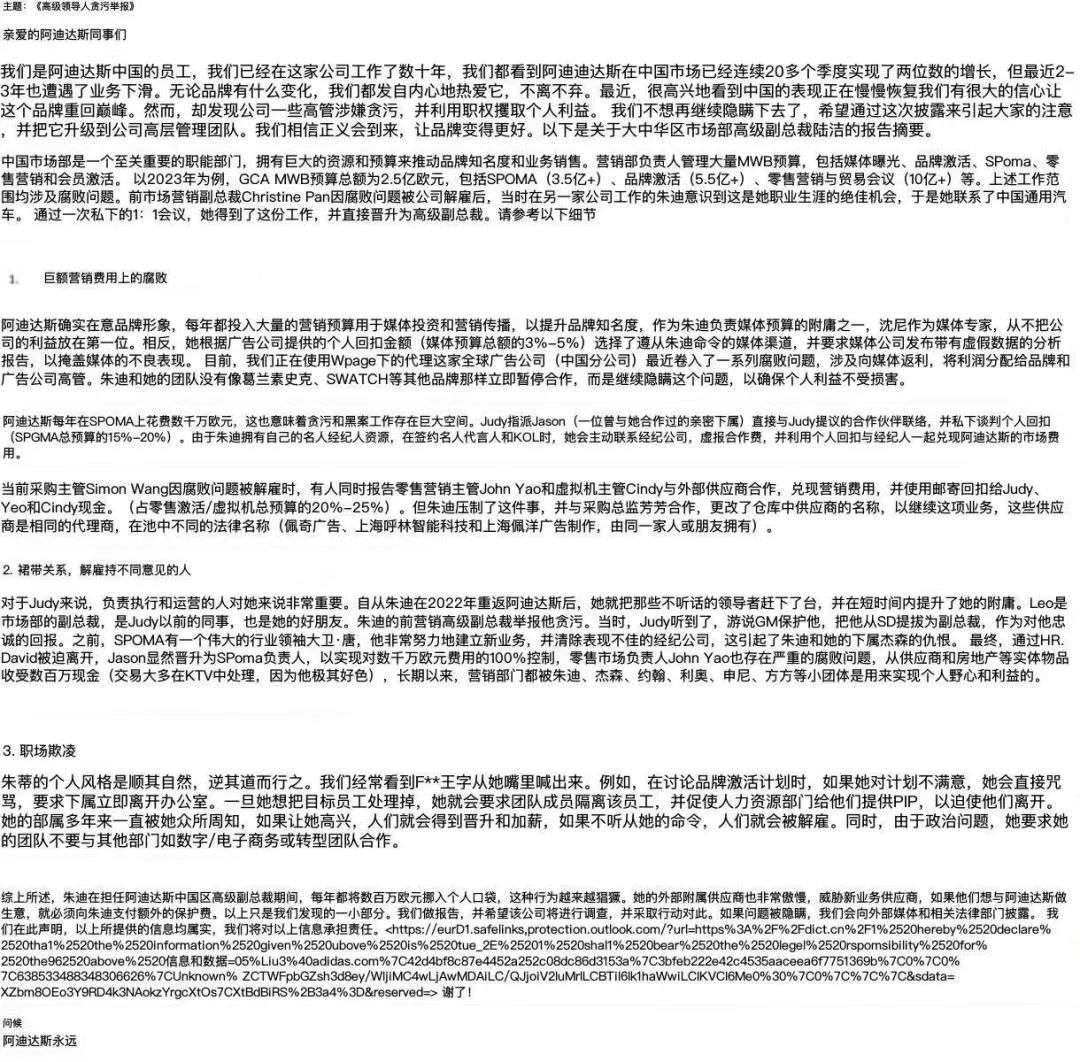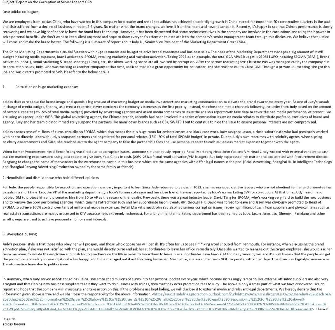 據舉報信內容,Judy Lu在鉅額營銷費用上存在腐敗行為,涉嫌在廣告公司、KOL合作等方面“吃回扣”。此外,她還被指解僱持不同意見的員工,存在職場霸凌行為。舉報信直接發送到阿迪達斯德國總部,並在社交媒體平台上公開,引發輿論熱議。