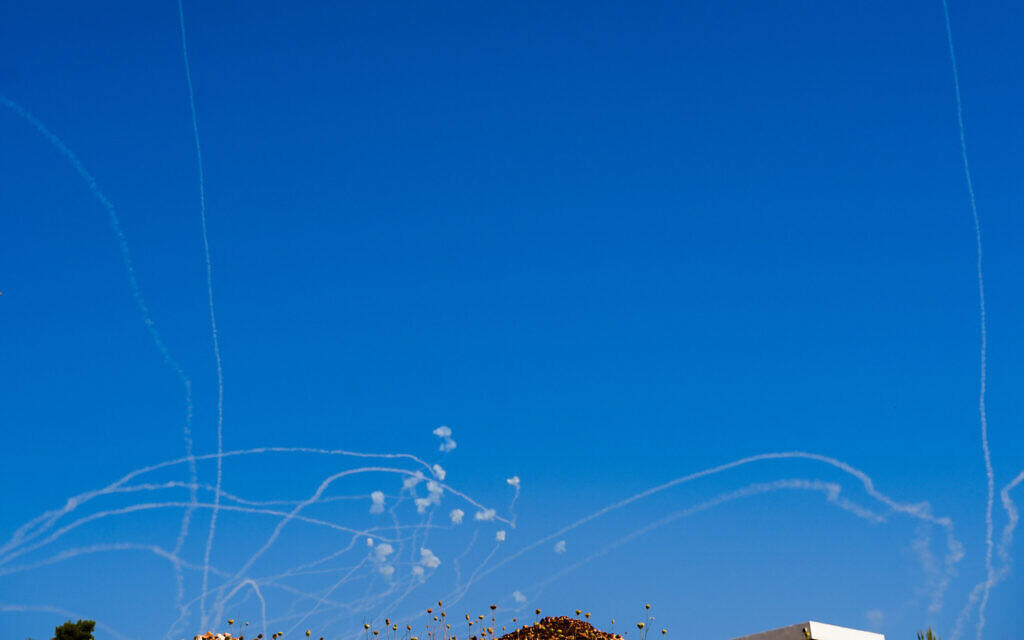 當地時間12日,以色列北部城鎮羅什皮納上空,防空系統攔截自黎巴嫩發射的火箭彈 (以色列時報)