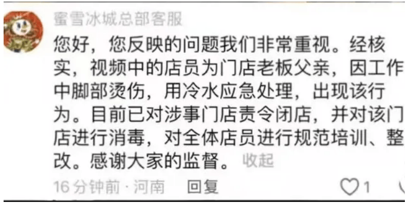 11日,蜜雪冰城方面回應稱:經核實,視頻中的店員為門店老闆父親,因工作中腳部燙傷,用冷水應急處理,出現該行為。目前已對涉事門店責令閉店,並對該門店進行消毒。