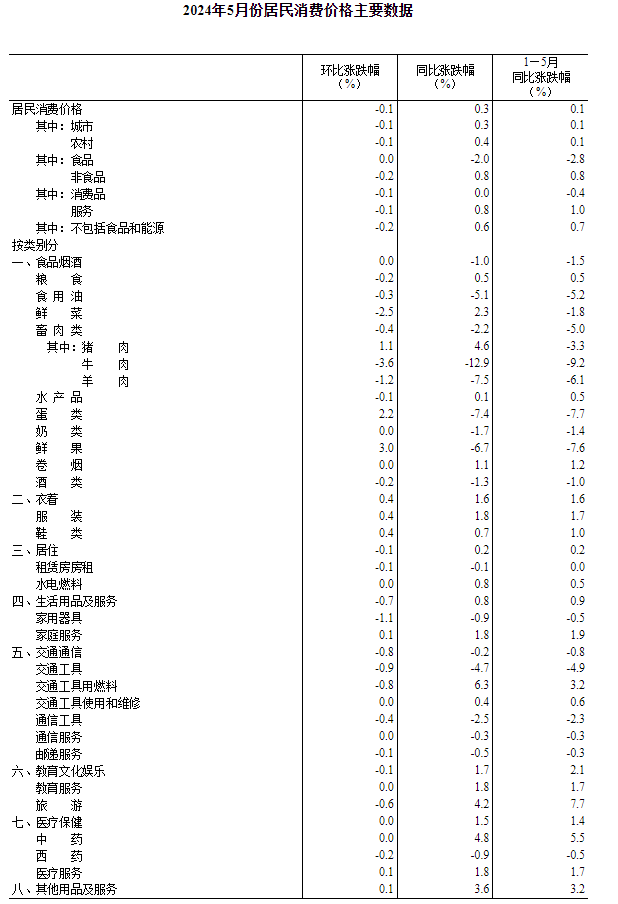 國家統計局網站6月12日發佈數據,2024年5月份,全國居民消費價格同比上漲0.3%。其中,城市上漲0.3%,農村上漲0.4%;食品價格下降2.0%,非食品價格上漲0.8%;消費品價格持平,服務價格上漲0.8%。1—5月平均,全國居民消費價格比上年同期上漲0.1%。