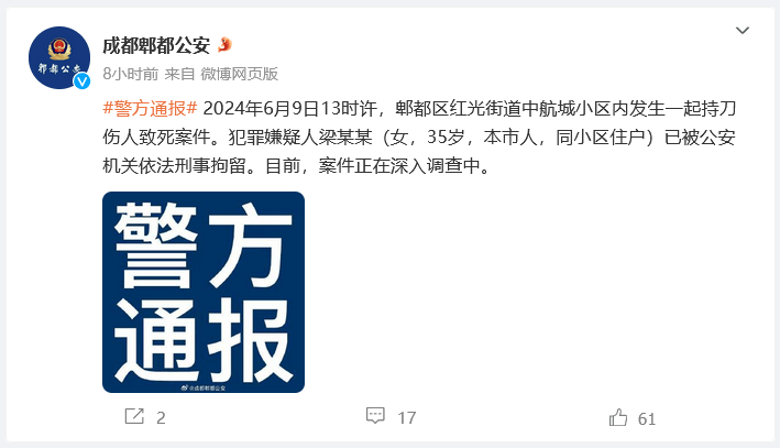 6月11日晚,@成都郫都公安 微博發佈警方通報:6月9日13時許,郫都區紅光街道中航城小區內發生一起持刀傷人致死案件。犯罪嫌疑人梁某某(女,35歲,本市人,同小區住户)已被公安機關依法刑事拘留。目前,案件正在深入調查中。