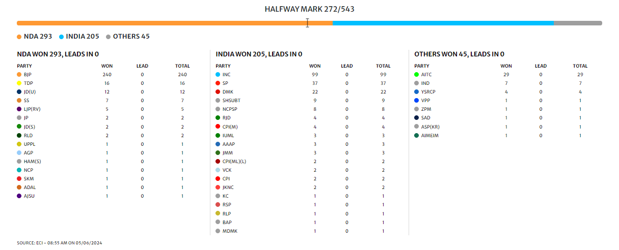 民眾敢怒不敢言,但可以用投票來表達心聲。最後大選結果出來,國際社會一片譁然:印人黨僅得240席——這得票數,不但沒達到莫迪此前所期望的370—400席,而且沒過議會總席位的1/2,即272席。這麼一來,印人黨雖然是得票數最多的政黨,但不得不組建聯合政府,接受盟黨和反對黨的掣肘。