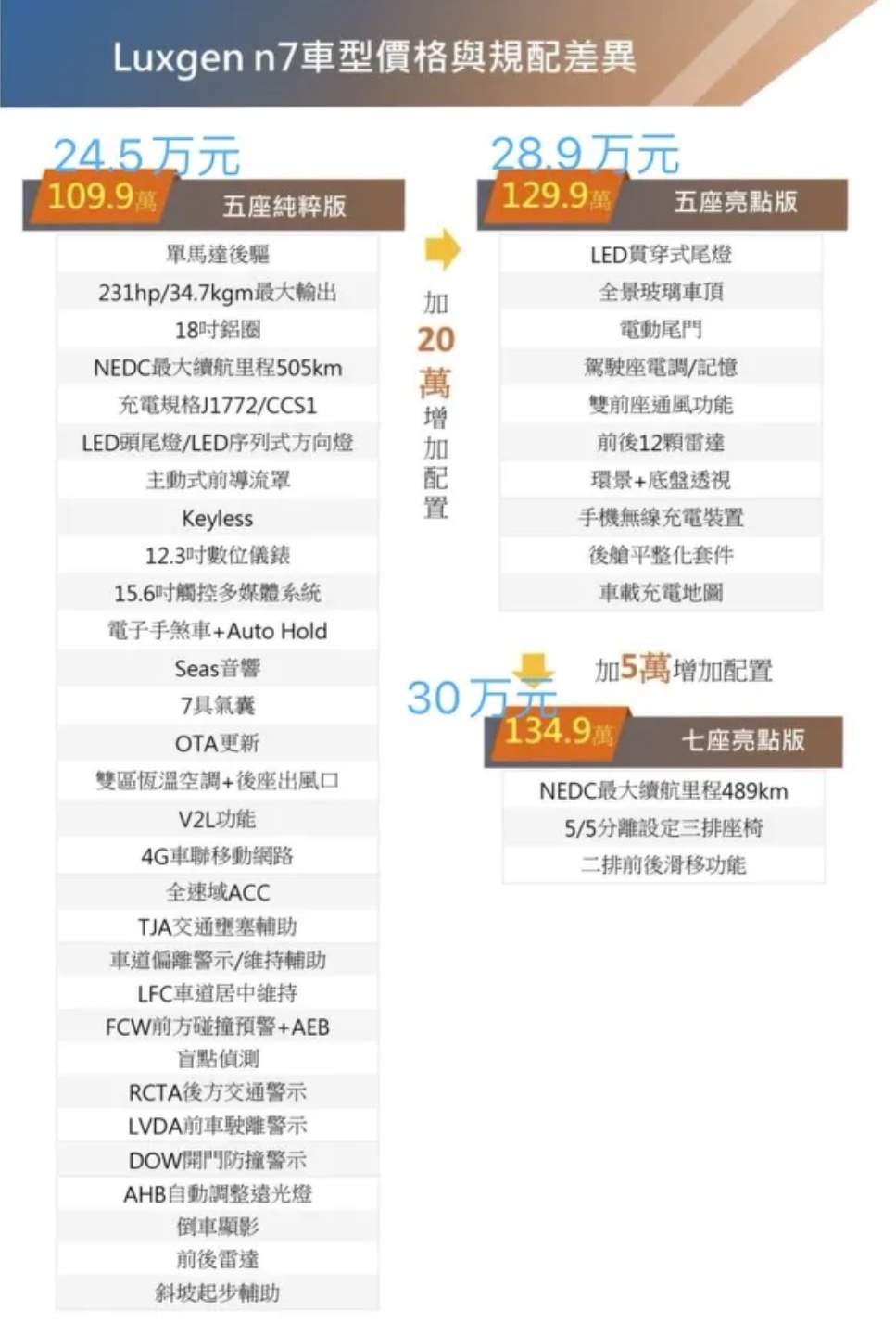 具體參數上,納智捷n7的尺寸和特斯拉Model Y相差無幾,長寬高4695*1895*1625mm,軸距2920mm,共有三個版本:5人純粹版、5人亮點版、7人亮點版,售價分別在24.5萬、28.9萬、30萬元人民幣左右。