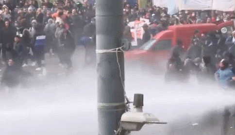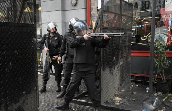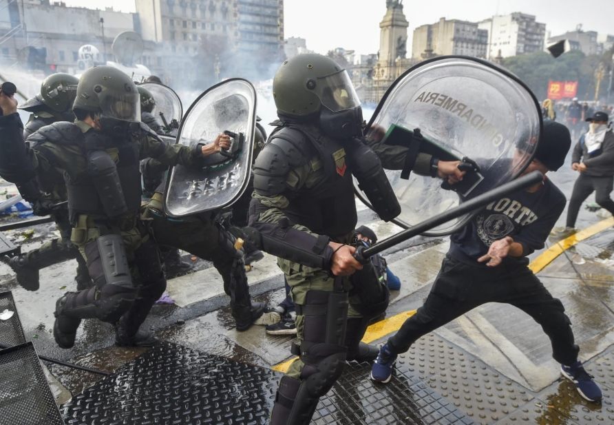 大量示威者向全副武裝的防暴警察投擲棍棒、石塊和燃燒瓶,警察則噴灑水炮、胡椒噴霧和催淚瓦斯來驅散大批人羣。示威者還向兩輛汽車潑灑汽油並將其點燃,將布宜諾斯艾利斯市中心廣場變成了煙霧繚繞的“戰場”。