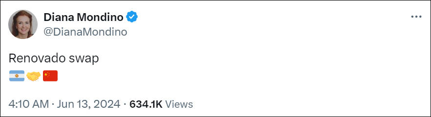去年12月,阿根廷《民族報》(La Nación)曾援引高級官方消息人士稱,阿現任總統米萊已致信中方,請求中方支持並加快推進兩國貨幣互換,擴大上屆政府與中方達成的貨幣互換協議。隨後,多家阿根廷媒體紛紛報道稱,中國暫停了與阿根廷的貨幣互換協議,並且直到米萊政府表現出想要同中方接觸的明確意圖後才會“解凍協議”。