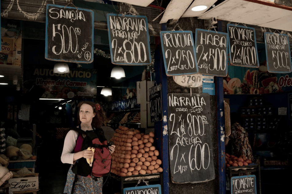 阿根廷的一家商店,物品標價通常用粉筆書寫,以便隨時修改上漲的物價。(《紐約時報》)