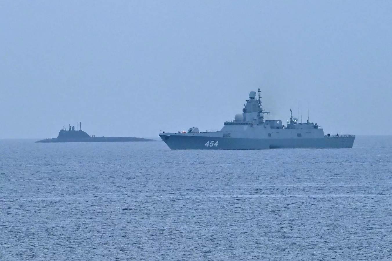 準備進入哈瓦那港的“戈爾什科夫海軍元帥”號護衞艦與“喀山”號核潛艇 圖片來源:俄新社