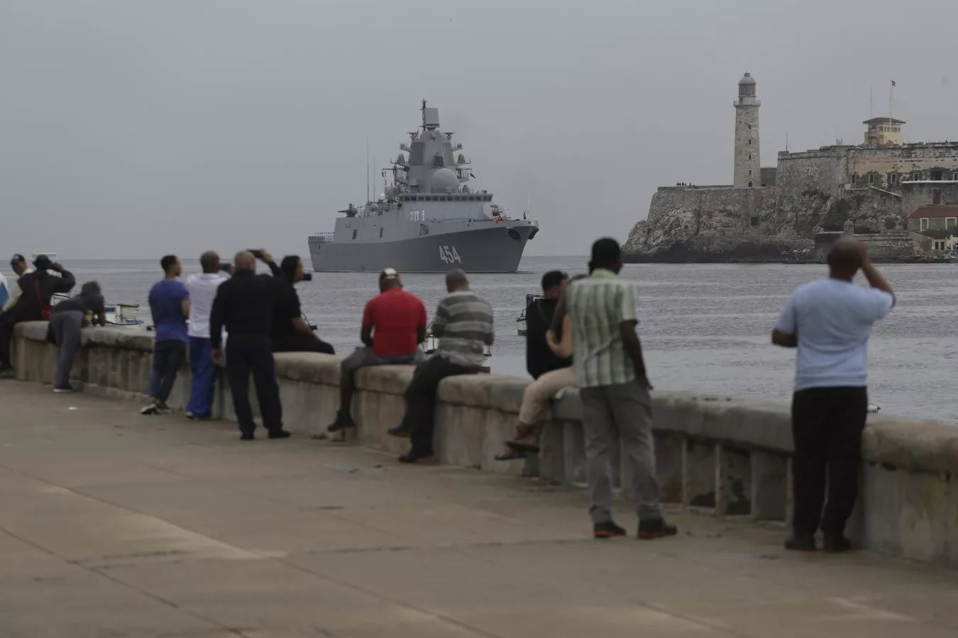 古巴當地民眾在岸邊觀看抵達哈瓦那港的俄羅斯海軍“戈爾什科夫海軍元帥”號護衞艦 圖片來源:俄新社
